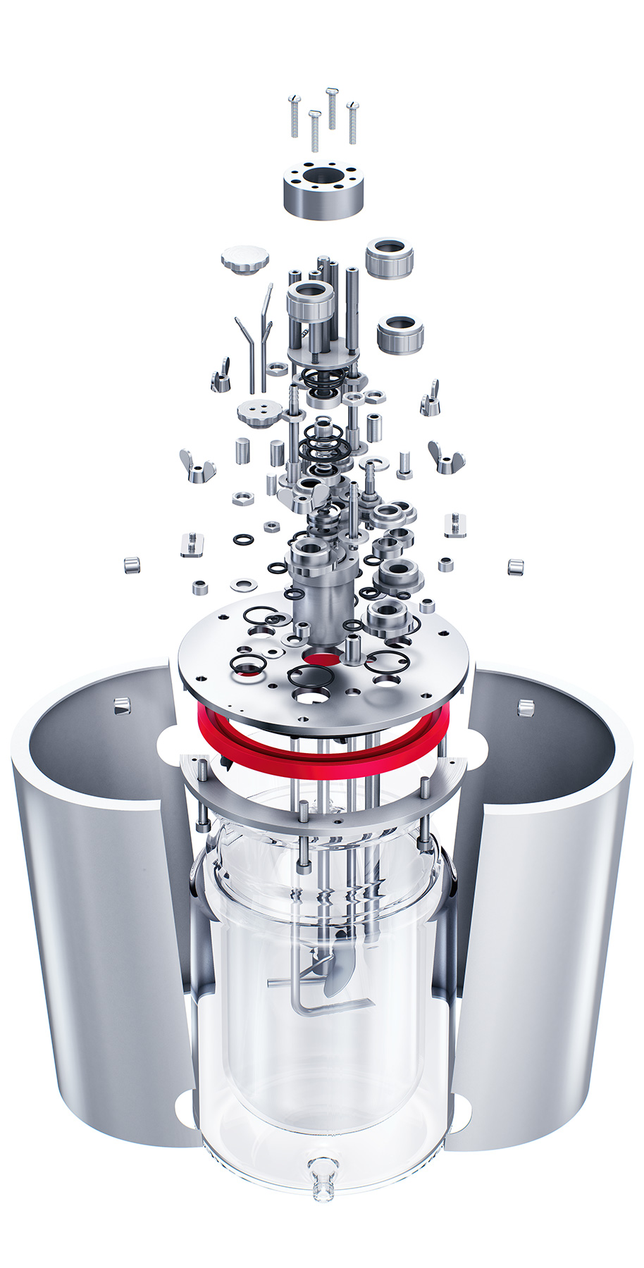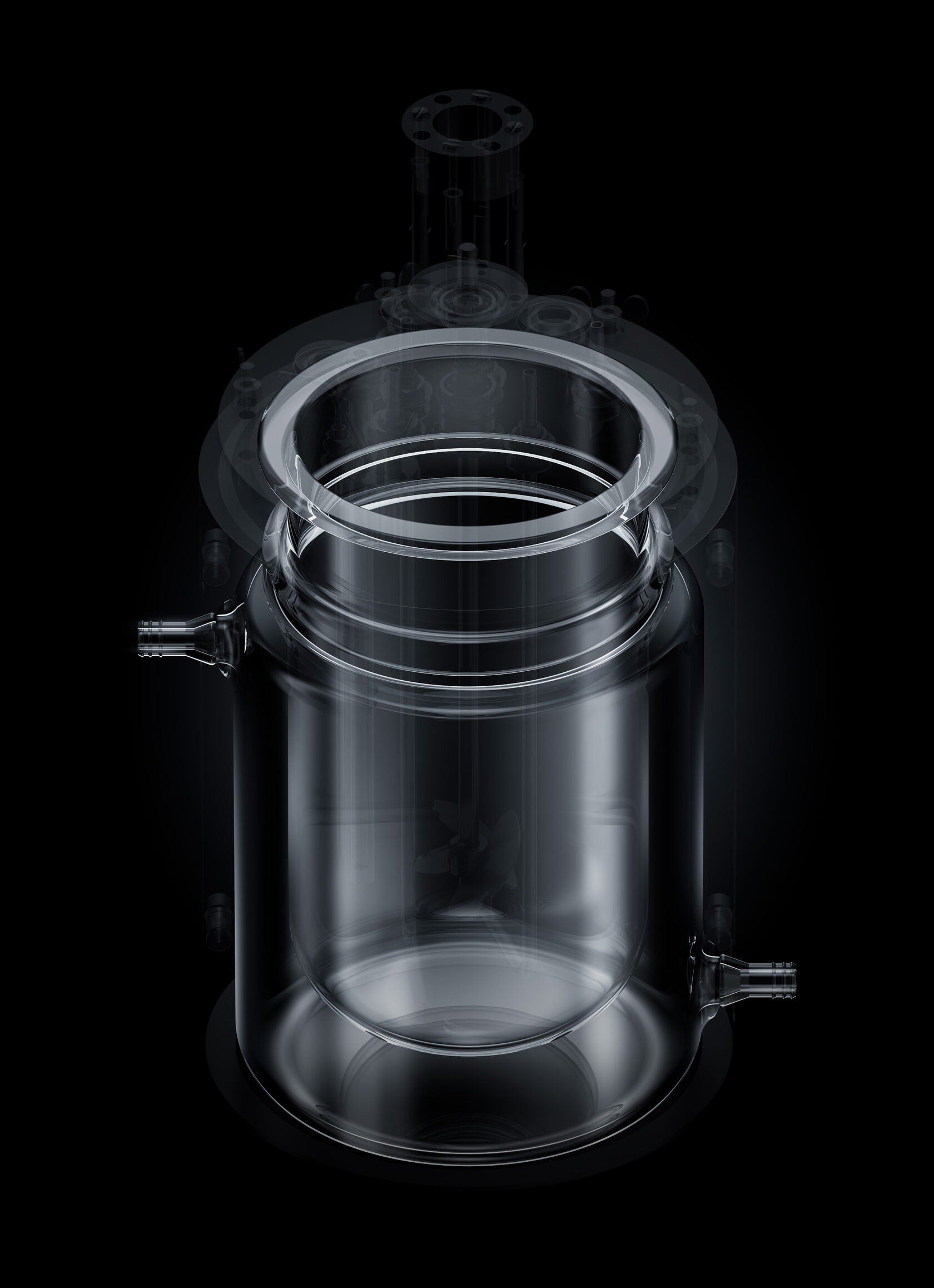 Колба биореактора изготавливается индивидуально из боросиликатного стекла. Доступны любые объёмы исполнения от 1 до 14 литров. Возможно нанесение шкалы объёма заполнения внутри рубашки.